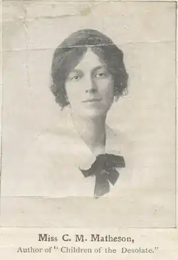 She appears in A & C Black's Who's Who from 1919 to 1934. The listing in the 1919 edition reads: "MATHESON, C. M.; b. near Liskeard ; unmarried. Took up work on the land as war work, 1915; trained at Sparsholt, Winchester; Member of Women's National Land Service Corps; employed first on Wiltshire Dairy Farm, then by the Prince of Wales in Cornwall (as herdswoman); very enthusiastic with regard to training and stock rearing. Publications: The Generation Between, 1915; Children of the Desolate, 1916; The Silver Cord, 1919. Address: The Lodge, Princetown, Devon."[23][24]