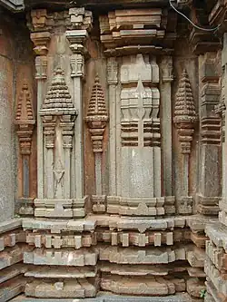 The temple has all the basic elements of a standard Hoysala temple and comprises a sanctum which is connected to a closed hall by a square vestibule (sukhanasi). The entrance into the hall from the outside is through a porch (mukhamantapa). Typically, a closed hall in a Hoysala temple has no windows. The porch consists of an awning supported by two decorative half pillars with two parapets on both sides. The shrine has a tower (called shikhara). The vestibule has its own tower (also called sukhanasi) which appears like a low extension of the main tower over the shrine. Art critic Gerard Foekema calls it the "nose" of the main tower. From the outside, the walls of the vestibule are inconspicuous and appear like a short extension of the shrine wall.[4][5][6] The ceiling of the closed hall is supported by four lathe turned pillars. These pillars divide the ceiling into nine highly decorated bays.[5] Between full pilasters, the outer walls of the hall and shrine are decorated with turrets and miniature towers on half-pilasters (aedicula). Below these, forming the base of the temple, are the five horizontal moldings.[7]