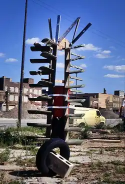 Alamo-Costello has worked on a range of public, temporary and experimental projects that present artwork in non-traditional settings to "non-art" audiences and explore themes of ephemerality, randomness, communication, and trust.[1][28][22] His first forays into this work came about as a founding member of "Armpit" (1992–8), a performance and public art group that included himself and artists Jesse Bercowetz, Nick Nuccio and Michael Plaza.[27][28] Between 1993 and 1995, they embarked on three "art walks"—the longest, a 298-mile Chicago-to-St. Louis trip—wheeling carts of their own sculpture as a "roving street gallery" bringing contemporary art to communities and viewers that normally have little contact with it in their own environments.[25][29][9] In 1994, they created a temporary display of large "urban drop-offs" or "urban totems" in empty Chicago city lots that they made from refuse (cinder blocks, hunks of concrete, scrap wood, tubes and old tires) found on-site.[27][22] The Chicago Reader's Fred Camper described it as a "guerrilla installation" of "near-chaotic accretions" that "gains much from its relationship to the site, and from the social goals that made the group choose it."[27][22]