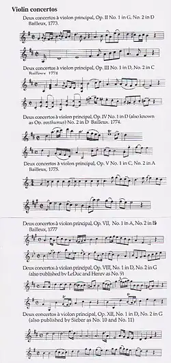 Saint-Georges's first composition Op. I, probably composed in 1770 or 1771, was a set of six string quartets, among the first in France, published by famed French publisher, composer, and teacher Antoine Bailleux.[39] He was inspired by Haydn's earliest quartets, brought from Vienna by Baron Bagge. Also in 1770, Carl Stamitz dedicated his own set of six string quartets to Saint-Georges.[40] By 1771, Gossec had appointed Saint-Georges as the concert master of the Concert des Amateurs.[41]