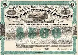 The Chicago, Danville and Vincennes Railroad was a railroad company that served various communities along the eastern border of the U.S. state of Illinois in the 1870s. The original plan called for a line to connect Chicago with Lawrence County, Illinois (across the river from Vincennes, Indiana), via Danville and Paris; it ran from Chicago to Danville before it was consolidated into the Chicago and Eastern Illinois Railroad in 1877.[1]