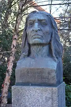 Chief of the Suquamish – Chief Seattle, also known as Bust of Chief Seattle and Chief Seattle Fountain, is a bust depicting Chief Seattle by artist James A. Wehn.[1] It was commissioned by the Seattle Park Board to accommodate the Alaska-Yukon-Pacific Exposition, and initially sat on a fountain for men, dogs and horses.[1]