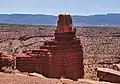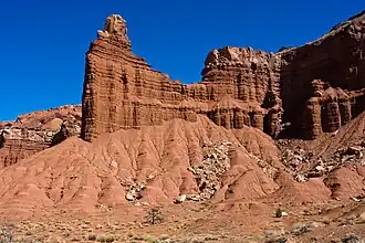 This feature is an erosional remnant composed of red sandstone of the Moenkopi Formation, topped with a Shinarump Conglomerate caprock of the Chinle Formation.[6] The Moenkopi Formation dates to about 245 million years ago, having formed during the Triassic. Long after the sedimentary rocks were deposited, the Colorado Plateau was uplifted relatively evenly, keeping the layers roughly horizontal, but Capitol Reef is an exception because of the Waterpocket Fold, a classic monocline, which formed between 50 and 70 million years ago during the Laramide Orogeny.[7]
