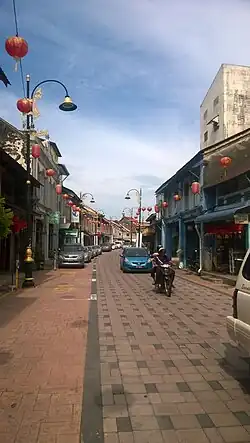Chinatown was opened about 300 years ago by the traders from Southern China and was the first area for business and trading in Kuala Terengganu, although in its current form, the oldest building (many of which are shophouses) dates back from the late 1800s.[7] Today, there are about 270 pre-war Chinese shophouses.[8] Many of these shophouses were originally built with brick, plaster, and timber. Currently, due to the old age of these structures, refurbishments and renovations are carried out to a number of buildings.