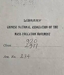 Chinese National Association of the Mass Education Movement (Traditional Chinese: 中華平民教育促進會, Simplified Chinese: 中华平民教育促进会), was founded in 1923 with the aim of using popular, accessible education as a means of societal reform, by Tao Xingzhi, Zhu Qihui, and Y. C. James Yen and educational representatives from various provinces.[1] Initially based in Beijing, branches were successively established in more than 20 provinces and regions across the country, where they opened schools for the common people in rural areas. Zhu Qihui served as the chairwoman, Tao Xingzhi was the secretary of the board of directors, and Yan Yangchu was the general secretary.[2]