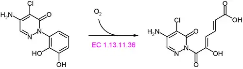 Thus, the two substrates of this enzyme are 5-amino-4-chloro-2-(2,3-dihydroxyphenyl)-3(2H)-pyridazinone and oxygen, whereas its product is 5-amino-4-chloro-2-(2-hydroxymuconoyl)-3(2H)-pyridazinone.