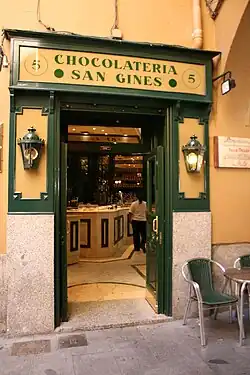The Chocolatería San Ginés is a café at Pasadizo de San Ginés, 5, in central Madrid, in a passageway close to San Ginés church, west of the Puerta del Sol.[1] It has served principally chocolate con churros (hot chocolate and churros) since 1894.