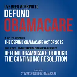 According to his website, since arriving in Congress, Stewart "consistently supported efforts to defund and repeal Obamacare." He co-sponsored the Defund Obamacare Act of 2013 and supported other efforts to "repeal, defund or dismantle the law." He also promised to "continue to do all that [he] can to seek strategic opportunities to... defund, delay and repeal this healthcare law." In place of Obamacare, Stewart supported the American Healthcare Reform Act.[43]