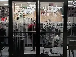 Lavanderia depicts a series of laundromat windows in the Boyle Heights neighborhood of Los Angeles. Fernandez says of the project: “The window is a membrane, because the outside and the inside are delineated by that graffiti. The paint etched into the glass, and was drippy at the same time, so it had the appearance of visual violence in a way, but it’s also very beautiful.” She adds: “I became interested in the aesthetic because I was living in Boyle Heights in the mid-1990s, and the prices of family homes have just skyrocketed. It’s going to become problematic for people. It has become problematic for the people.” [15]
