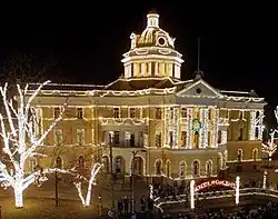 The Old Harrison County Courthouse in Marshall, Texas, outlined in Christmas lights