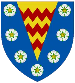 Azure on a pile Or between seven roses Argent barbed and seeded Proper three barrulets dancetty Gules.