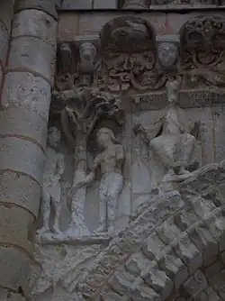 Adam, Eve and Nebuchadnezzar II: above the door, a panel of high reliefs can be seen: this illustrates passages from the Bible. The selected scenes, taken from both Testaments, tell the Annunciation and the Incarnation of God on earth in the person of Jesus Christ to save humanity. From left to right may be seen the original sin, Nabuchodonosor King of Babylon, the prophets Daniel, Moses, Isaiah and Jeremiah. They are followed by the Annunciation, the Tree of Jesse and King David. This first half of the panel, portraying those who foresee the arrival of a Saviour in the Old Testament, the Annunciation and the ancestors of the Virgin, evokes the relationship which exists between the Old Testament and the New in the Christian Church. On the other side of the entrance, may be seen the Visitation, between the towns of Nazareth and Jerusalem. The town of Nazareth represents also the Synagogue, that of Jerusalem the Church: these are represented like medieval cities. The passing from the Jewish law to the new Christian law is portrayed in these 12th century carvings. This scene is followed by the Nativity of Jesus and the Bath of the Child (drawn from apocryphal books). The Bath of the Child includes the eucharistic cup, thus foreseeing the events of Christ's Passion. St. Joseph, is perplexed by what he has experienced. Below Joseph, two men are represented fighting (according to a recent study (cf bibliography) this is Jacob wrestling with the Angel). Just above, the arcades hold statues of the twelve apostles and two bishops. According to local tradition the bishops are St Hilary of Poitiers and St Martin of Tours. The historians of art prefer not see the figures as portraits but as representations of bishops as heirs to the apostles, therefore represented on the same level. The attitudes are different: on the right, a bishop points out the episcopal capacity of the bishops of Poitiers, barons of Poitou. On the left, the bishop carries the papal attributes of the 12th century (the bishop of Rome, evoking the papal power in the period of the Gregorian reform). Finally the Second Advent is represented above: Christ is shown standing upright in a mandorla, surrounded by Cherubim and the Sun and the Moon.