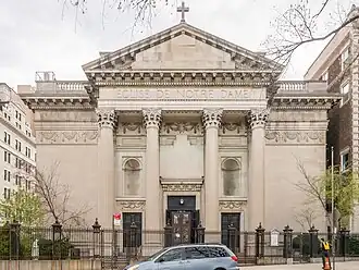 Fathers of Mercy, a French community of priests, established the Church of Notre Dame in 1910 as a mission of the St. Vincent de Paul Parish on West 23rd Street. The church had been established after Geraldyn Redmond donated funds to the Fathers of Mercy, requesting they build a chapel to propagate devotion to Our Lady of Lourdes.[3] The first administrator of the parish was the Rev. Maurice Reynauld, S.P.M., who died in France during World War I.[4] While in France in 1913, he affiliated Notre Dame Church with the Sanctuary of Our Lady in Lourdes, thus enabling worshipers at the Church of Notre Dame in New York City to obtain the spiritual benefits of worshipers at Lourdes. From the beginning of the parish, a special arrangement was made with the ecclesiastical authorities in Lourdes that water from the miraculous spring there would be sent directly to the Church of Notre Dame. Since that time Lourdes water has been continuously available at the church.