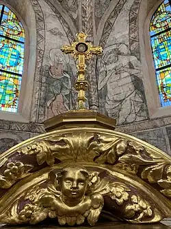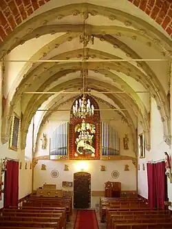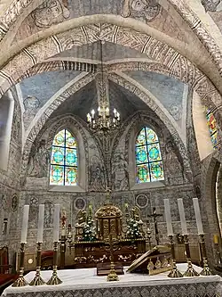 The presbytery, east oriented, is a little older than the nave (dating from the 14th century), and it has two cross vault bays. In each bay where the fins cross, there is a round, evenly carved keystone; one with a smoot coat of arms, another with a double cross symbolic of the Holy Sepulcher order. In the bay closer to the nave on its opposite walls you can notice some semicircular niches divided by three ogival arcades, once used by the monks as their seats (sedilla). There is a niche vaulted with a gothic arch in the second bay, placed in the southern wall. Opposite in the northern wall, a niche for a tabernacle with new-stone setting can be observed.[5]