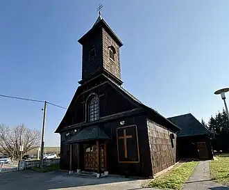 The exterior of the church is defined by a tower, a gable and vertically clad walls with wooden panelling and narrow battens. This intervention was carried out during the renovation of 1856, when the interior was plastered. This intervention represented a transition towards the imitation of masonry architecture which was considered more elegant.[2]
