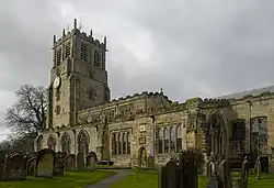 Whilst the present church dates back to the 13th century, additions and restorations were carried out in the 14th, 15th and 19th centuries.[9] The nave and north aisle date to the 12th/13th century whereas the south aisle and south chapel were constructed around 1290.[10] As with many churches of its time, additions and extensions were added at different dates; in the late 12th century the chancel was extended southwards into the south chapel (later the Lady Chapel), with the south aisle and chapel being rebuilt in 1290. As such, the church displays three different types of architecture; Decorated, Early English and Perpendicular.[11] Detailed structural analysis estimates that the original Anglo-Saxon church on the site has been suggested to have been 48 feet (15 m) long, 24 feet (7.3 m) wide and 24 feet (7.3 m) tall.[12] The present church is 120 feet (37 m) long, 61 feet (19 m) wide, with the tower height being 98 feet (30 m) high.[13] It is dedicated to Saint Gregory, but the date of dedication is unknown. It was known as the Church of St Gregory when Brian de Thornhill was rector in the 14th century, but the earliest written confirmation occurs in 1547 when it is specifically mentioned in a will.[14]