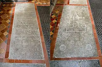 In the southwest corner of the nave can be found part of a 13th-century limestone marble slab, with an undeciphered inscription in Lombardic capitals along one margin. The communion rails were fitted at the bequest of William Meadston (died 1683). The door in the ground stage of the tower is formed of two leaves and is late-medieval, and originally was fitted in the west doorway. Prior to the restoration of 1880 there were two baptismal fonts in the church: one in the present position and one in the centre aisle. The present 13th-century font has an octagonal limestone marble bowl with two pointed arched panels in each face. The font's base has a cylindrical central pier with 19th-century peripheral shafts. The font's sub-base possibly incorporates the bowl of the earlier font which may well have been in use in the earliest church on this site.[4] The restored octagonal ogee font cover with crocketed ribs and finial is probably 16th-century.[1][2][4]