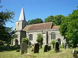 The Church of St Nicholas, Pluckley is located in Pluckley, Kent in England. There was a church at Pluckley as early as 1090 AD. The church was constructed with Kent ragstone. The chancel, nave and tower of St Nicholas dates to the 14th century.[1] The current church's oldest section is the north-west corner of the nave, which dates to the Norman period.[2] The chancel contains a piscina and a double sedilia. The chancel, door, tower window and spire were added in the 14th century. The east end has a pair of blocked lancet windows dating from before the 13th century. The spire was added in the 14th century, as were the chancel, door and tower window. The south chapel, the south aisle and porch were added in the 15th century.[1]