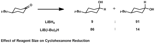 The Cieplak effect uses hyperconjugation to explain the face-selective addition of nucleophiles to carbonyl carbons. Specifically, donation into the low-lying σ*C-Nuc bond by antiperiplanar electron-donating substituents is the stabilizing interaction which lowers the transition state energy of one stereospecific reaction pathway and thus increases the rate of attack from one side. In the simplest model, a conformationally constrained cyclohexanone is reduced to the corresponding alcohol. Reducing agents add a hydride to the carbonyl carbon via attack along the Burgi–Dunitz angle, which can come from the top along a pseudo-axial trajectory or from below, along a pseudo-equatorial trajectory. It has long been known that large reducing agents add hydride to the equatorial position to avoid steric interactions with axial hydrogens on the ring. Small hydride sources, however, add hydride to an axial position for reasons which are still disputed.[3]