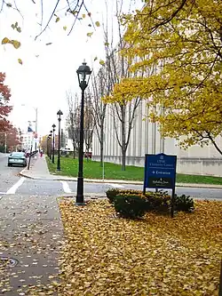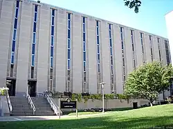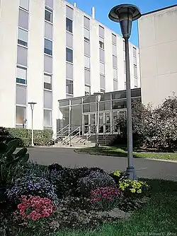 Langley Hall's construction was begun in 1959 made possible by a $2.5 million grant ($27 million today) from the General State Authority.[4] Completed in 1961 in the International Style,[5] Langley Hall was originally the home of the Department of Geology, Department of Psychology, and the Department of Biology, (now part of the Department of Biological Sciences).[3]. It was originally conceived as an annex to Clapp Hall, to which it is connected on the south side. For this reason, the room numbers in Langley Hall all begin with the letter 'A' to denote 'Annex.' The Department of Biological Sciences occupies the First, Second, Third, and Fifth floors of Langley Hall. Crawford Hall, home of the Department of Neuroscience, is connect to Langley Hall's north side, together forming the 3-building CLC complex that is devoted to the biological sciences, housing both biological sciences and neuroscience lectures and research laboratories.[4] A research greenhouse composed of four bays is located on Langley Hall's sixth floor.[6]