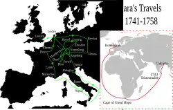She passed through Bologna in August and Milan in October. She arrived in Venice in January 1751, where she became a major attraction at the carnival and was painted by Pietro Longhi. She passed through Verona on the way back to Vienna. She had reached London by the end of the year, where she was viewed by the British royal family.