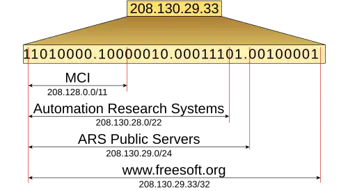 For example, in the late 1990s, the IP address 208.130.29.33 (since reassigned) was used by www.freesoft.org. An analysis of this address identified three CIDR prefixes. 208.128.0.0/11, a large CIDR block containing over 2 million addresses, had been assigned by ARIN (the North American RIR) to MCI. Automation Research Systems (ARS), a Virginia VAR, leased an Internet connection from MCI and was assigned the 208.130.28.0/22 block, capable of addressing just over 1000 devices. ARS used a /24 block for its publicly accessible servers, of which 208.130.29.33 was one. All of these CIDR prefixes would be used, at different locations in the network. Outside MCI's network, the 208.128.0.0/11 prefix would be used to direct to MCI traffic bound not only for 208.130.29.33, but also for any of the roughly two million IP addresses with the same initial 11 bits. Within MCI's network, 208.130.28.0/22 would become visible, directing traffic to the leased line serving ARS. Only within the ARS corporate network would the 208.130.29.0/24 prefix have been used.