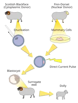 Dolly, a Finn-Dorset ewe, was the first mammal to have been successfully cloned from an adult somatic cell. Dolly was formed by taking a cell from the udder of her 6-year-old biological mother.[30] Dolly's embryo was created by taking the cell and inserting it into a sheep ovum. It took 435 attempts before an embryo was successful.[31] The embryo was then placed inside a female sheep that went through a normal pregnancy.[32] She was cloned at the Roslin Institute in Scotland by British scientists Sir Ian Wilmut and Keith Campbell and lived there from her birth in 1996 until her death in 2003 when she was six. She was born on 5 July 1996 but not announced to the world until 22 February 1997.[33] Her stuffed remains were placed at Edinburgh's Royal Museum, part of the National Museums of Scotland.[34]