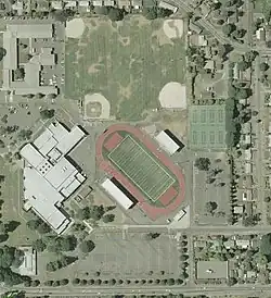 Aerial photo of Clover Park High School. The building in the upper left is part of the old high school, which now houses the Clover Park School District administrative offices.