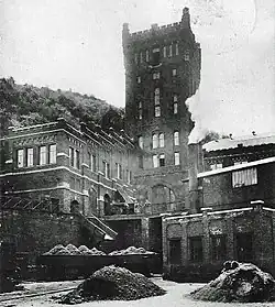 This first shaft was dug in 1850 to a depth of 250 metres.[1] After reviewing the mine to know its state, the engineers noticed that the coal was located deep down.[2] The first mine was dug again and reached a depth of 420 metres.[3] The place on which the mine is located is not very big. The extraction company decided [2] to build a headframe, a first in Belgium. This tower was fitted with an extraction machine and several motors working with direct current.[4] A washhouse was built in 1920 by Beer de Jemeppe company, and a second extraction mine with a metal tower opened.[1] In 1927, the Belle-Fleur mine[5] was equipped by a little tower made of reinforced concrete and a low power winch. Its work was to bring the tailings back to the surface.[1]