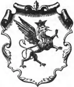 In accordance to 16th-century historian Bartosz Paprocki, its coat of arms depicted a red griffin with a crown on its head, standing on its back feat and with risen wings, placed in a white (silver) shield. However, according to 15th century historian Marcin Bielski, the coat of arms depicted a black griffin without a crown, instead.[15]