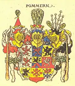 Above the shield, were placed three helmet. Above the top left field was placed a helmet with a ducal crown and a flat hat made out of a spiked top, made out of the ermine fur, with a large plume of peacock feathers on top, which represented the Principality of Rügen. The mantling, a drapery tied to the helmet, was black and yellow (golden). Above the top middle field was placed a helmet with a crown and a pointed hat with a small plume of peacock feathers, which represented the Pomerania-Stettin. The mantling of the helmet was red and blue. Above the top right field was placed a helmet with a crown and hat with a lily stems and a small plume of peacock feathers, which represented Pomerania. The mantling of the helmet was red and white (silver). On the sides of the shield were the supporters, in the form of creatures holding it. Originally they were a griffin and a lion. Not long after they were replaced by two wild men, figures depicting male humans wearing oak leaves around their hips, and holding clubs.[1]