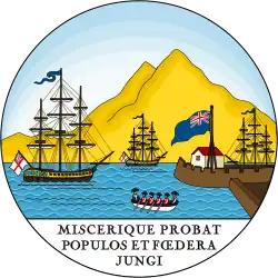 1889–1958 The badge of the crown-colony depicts the harbour of Port of Spain and mount El Tucuche with two Royal Navy frigate flying the white ensign and a boat with crew in the foreground. In base is the motto MISCERIQUE PROBAT POPULOS ET FOEDERA JUNGI, chosen by Sir Ralph Abercromby who captured Trinidad from the Spanish in 1797. The motto is quote from Virgil's Aeneid (Book IV, Line 112): ‘Miscerive probet populos, aut foedera iungi ’(He approved of the mingling of peoples and their being joined together by treaties).