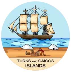 The Turks and Caicos Islands were ruled by the British colonial government in the Bahama Islands starting in 1799.[1] Tensions between the two territories,[2] coupled with financial troubles, led to the Turks and Caicos being given their own charter in 1848, before being placed under the administration of the Colony of Jamaica 26 years later.[1] During the 1870s, the territory was accorded its own badge to be utilised on its flag.[2][3] This consisted of two mounds of salt on land in the foreground, awaiting to be loaded onto a ship in the background. A door was erroneously added to one of the mounds, however, when the designer or an official at the Admiralty reportedly mistook the salt mounds for igloos.[2][3][4] This was not rectified up until a new coat of arms was instituted in the 1960s.[3]