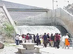 The Cochiti Dam is an earthen fill dam located on the Rio Grande in Sandoval County, New Mexico, approximately 50 miles (80 km) north of Albuquerque, New Mexico, in the United States. It also impounds the Santa Fe River. By volume of material, it is the 23rd largest dam in the world at 62,849,000 yd3 (48,052,000 m3) of material,[1] one of the ten largest such dams in the United States,[2] and the eleventh largest such dam in the world.[3] Cochiti Dam is one of the four United States Army Corps of Engineers projects for flood and sediment control on the Rio Grande system, operating in conjunction with Abiquiu Dam, Galisteo Dam and Jemez Canyon Dam.