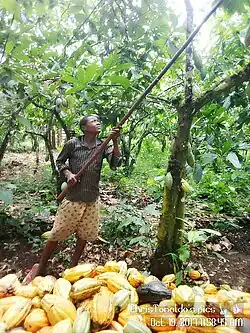 Immature cocoa pods have a variety of colours, but most often are green, red, or purple, and as they mature, their colour tends towards yellow or orange, particularly in the creases.[19][37] Unlike most fruiting trees, the cacao pod grows directly from the trunk or large branch of a tree rather than from the end of a branch, similar to jackfruit. This makes harvesting by hand easier as most of the pods will not be up in the higher branches. The pods on a tree do not ripen together; harvesting needs to be done periodically through the year.[19] Harvesting occurs between three and four times weekly during the harvest season.[19] The ripe and near-ripe pods, as judged by their colour, are harvested from the trunk and branches of the cacao tree with a curved knife on a long pole. Care must be used when cutting the stem of the pod to avoid damaging the junction of the stem with the tree, as this is where future flowers and pods will emerge.[19][38] One person can harvest an estimated 650 pods per day.[36][39]