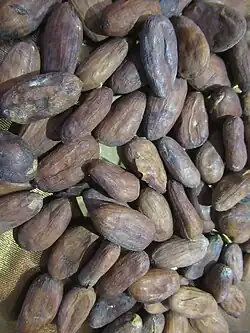 The harvested pods are opened, typically with a machete, to expose the beans.[19][36] The pulp and cocoa seeds are removed and the rind is discarded. The pulp and seeds are then piled in heaps, placed in bins, or laid out on grates for several days. During this time, the seeds and pulp undergo "sweating", where the thick pulp liquefies as it ferments. The fermented pulp trickles away, leaving cocoa seeds behind to be collected. At the end of this process, the seeds change color from pale yellow or violet to brown.[40] Sweating is important for the quality of the beans,[41] which originally have a strong, bitter taste. If sweating is interrupted, the resulting cocoa may be ruined; if underdone, the cocoa seed maintains a flavor similar to raw potatoes and becomes susceptible to mildew. Some cocoa-producing countries distill alcoholic spirits using the liquefied pulp.[42]