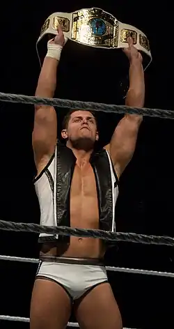 In September, he began a feud with Hardcore Holly and lost three consecutive matches to him.[35][36][37] Later, they would work as a tag team and they defeated Lance Cade and Trevor Murdoch on the Raw 15th Anniversary special episode for the World Tag Team Championship, marking Rhodes's first championship in WWE.[38][39]