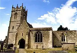 The oldest parts of the Church of England parish church of All Saints are late 12th-century;[8] other parts are 13th-century and the tower is 15th-century. The building was refashioned in the 18th century and restored by Street.[9] In 1708, Abraham I Rudhall of Gloucester cast a ring of five bells for the west tower. In 1884, Mears and Stainbank of the Whitechapel Bell Foundry recast the third bell.[3] In 1938, Mears and Stainbank cast a new treble bell to increase the ring to six.[10] All Saints is a Grade II* listed building.[8]