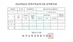 26. ^ 남, 지원·김지혜·최미랑 (2017-11-24). "[2018 수능]입시 최대 변수는 '영어 절대평가'···최상위권-상위권 극명히 갈려 [2018 CAST] The biggest variable in the entrance examination is the English Absolute Evaluation,··The top-to-upper ranks sharply divided". Kyunghyang Shinmun (in Korean). Retrieved 2020-11-05.