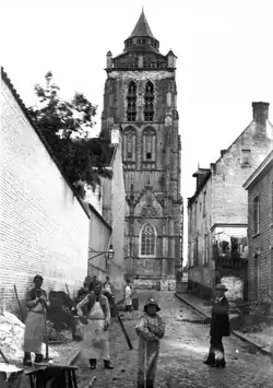 The current Brabantine Gothic building was erected in stages, mostly from around 1350 to 1527.[2][3] At that time, Anderlecht was still a village in the outskirts of Brussels counting barely 300 inhabitants.[6][10] Built in the centre of the village, the church was intended for gatherings much bigger than just the parish community, hence its large size.[6][11] Hendrik de Mol was responsible for the works from 1443, succeeding his friend Gillis Joos.[12] De Mol was in turn succeeded by Jan van Ruysbroeck, the court architect of Philip the Good,[12][13] who also designed the tower of Brussels' Town Hall.[12][14] Van Ruysbroeck mainly oversaw the construction of the choir in the 1460s. After him, Jan van Evergem took over the works in 1485, followed by his son Hendrik. The famous master builder Louis van Bodeghem, the architect behind the Royal Monastery of Brou at Bourg-en-Bresse, France, designed the portal. From 1517, Matthijs III Keldermans worked on the originally square tower up to the balcony, as well as the side chapels. Construction was still underway in 1527.[12]