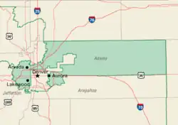 The 7th congressional district was created following the 2000 U.S. census and associated realignment and reapportionment of Colorado congressional districts. It formerly consisted of portions of Adams, Arapahoe, and Jefferson counties, see above for the more recent list. The boundaries were drawn by a court after the state legislature failed to agree on a redistricting plan.[5]