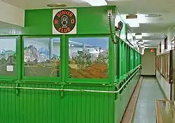 The museum building is a replica of an 1880s-style railroad depot. Exhibits feature original photographs by pioneer photographers such as William Henry Jackson and Louis Charles McClure, as well as paintings by Howard L Fogg, Otto Kuhler, Ted Rose and other artists. Locomotives and railroad cars modeled in the one inch scale by Herb Votaw are also displayed. A bay window contains a reconstructed depot telegrapher's office, complete with a working telegraph sounder.