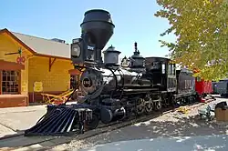 Denver, Leadville & Gunnison RR 191, after restoration. The engine is the oldest steam engine in Colorado. It's restoration included several of its 1800s engineering components such as a diamond stack, box headlight, and wooden pilot (cowcatcher).