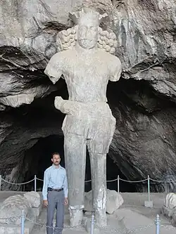 The statue is about 35 m from the cave entrance, on the fourth of five terraces, lying approximately 3.4 m below the level of the cave entrance. Its height of about 6.7 m and breadth across the shoulders of more than 2 m make it one of the most impressive sculptures from the Sassanian period.