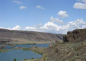 The Columbia Plateau ecoregion is a Level III ecoregion designated by the United States Environmental Protection Agency (EPA) encompassing approximately 32,100 square miles (83,139 km2)[1] of land within the U.S. states of Washington, Oregon, and Idaho. The ecoregion extends across a wide swath of the Columbia River Basin from The Dalles, Oregon to Lewiston, Idaho to Okanogan, Washington near the Canada–U.S. border. It includes nearly 500 miles (800 km) of the Columbia River, as well as the lower reaches of major tributaries such as the Snake and Yakima rivers and the associated drainage basins. It is named for the Columbia Plateau, a flood basalt plateau formed by the Columbia River Basalt Group during the late Miocene and early Pliocene. The arid sagebrush steppe and grasslands of the region are flanked by moister, predominantly forested, mountainous ecoregions on all sides. The underlying basalt is up to 2 miles (3 km) thick and partially covered by thick loess deposits.[2] Where precipitation amounts are sufficient, the deep loess soils have been extensively cultivated for wheat. Water from the Columbia River is subject to resource allocation debates involving fisheries, navigation, hydropower, recreation, and irrigation, and the Columbia Basin Project has dramatically converted much of the region to agricultural use.[2][3][4]