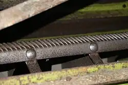 The straw walkers are located above the sieves, and also have holes in them. Any grain remaining attached to the straw is shaken off and falls onto the top sieve.