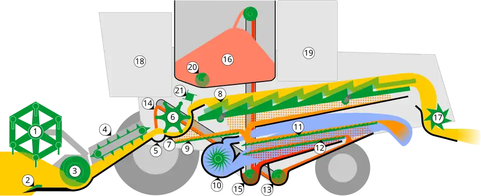| 1) Reel 2) Cutter bar 3) Header auger 4) Grain conveyor 5) Stone trap 6) Threshing drum 7) Concave 8) Straw walker 9) Grain pan 10) Fan | 11) Top adjustable sieve 12) Bottom sieve 13) Tailings conveyor 14) Rethreshing of tailings 15) Grain auger 16) Grain tank 17) Straw chopper 18) Driver's cab 19) Engine 20) Unloading auger 21) Impeller |