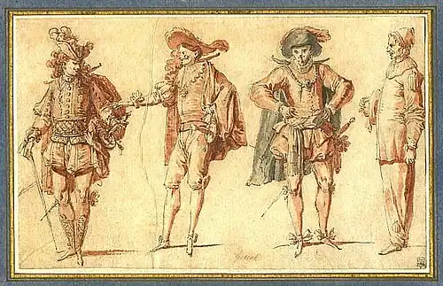 While the iconography gives evidence of the performance style (see Fossard collection), many of the images and engravings were not depictions from real life, but concocted in the studio. The Callot etchings of the Balli di Sfessania (1611) are most widely considered capricci rather than actual depictions of a commedia dance form, or typical masks. While these are often reproduced in large formats, the actual prints measured about 2×3 inches. In the 18th century, Watteau's painting of commedia figures intermingling with the aristocracy were often set in sumptuous garden or pastoral settings and were representative of that genre.