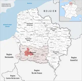 The Communauté d'agglomération du Beauvaisis is a communauté d'agglomération located in the Oise department and in the Hauts-de-France region of France. Its seat is in the town Beauvais. It was created on 1 January 2017 by merger of the former Communauté d'agglomération du Beauvaisis with the Communauté de communes rurales du Beauvaisis,[1] and was expanded with 9 communes from the Communauté de communes de l'Oise Picarde in January 2018.[2] Its area is 539.0 km2. Its population was 103,934 in 2020, of which 56,889 in Beauvais proper.[3]