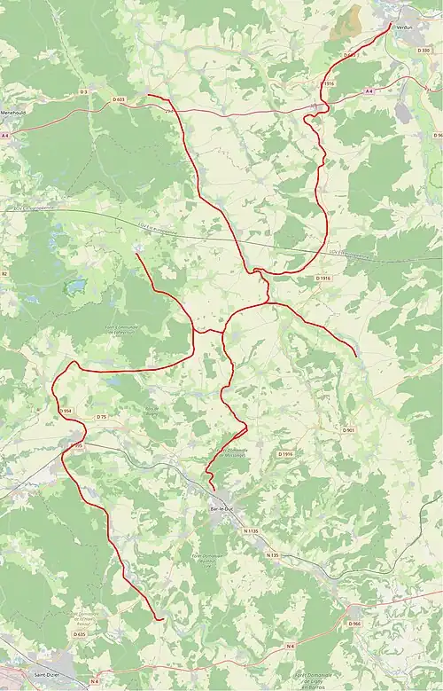 - ^ Meuse-Argonne offensive, map showing daily position of front line - Map Room G-3, G.H.Q., May 24, 1919 (Route of the track in and near Verdun).